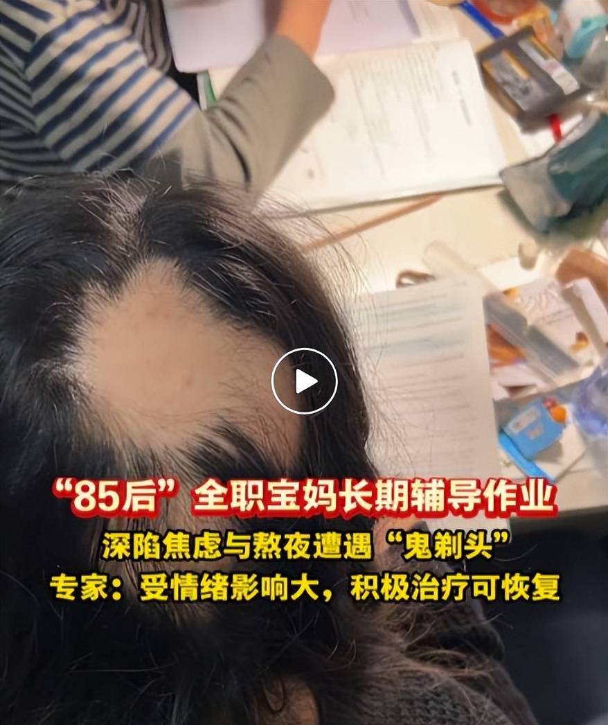 近日,江苏苏州一位“85后”全职宝妈肖女士的遭遇,让无数妈妈看得揪心。因长期全职陪读、辅导孩子作业,她深陷焦虑与熬夜的漩涡,头发竟大把脱落,最终被确诊为严重的急性斑秃。